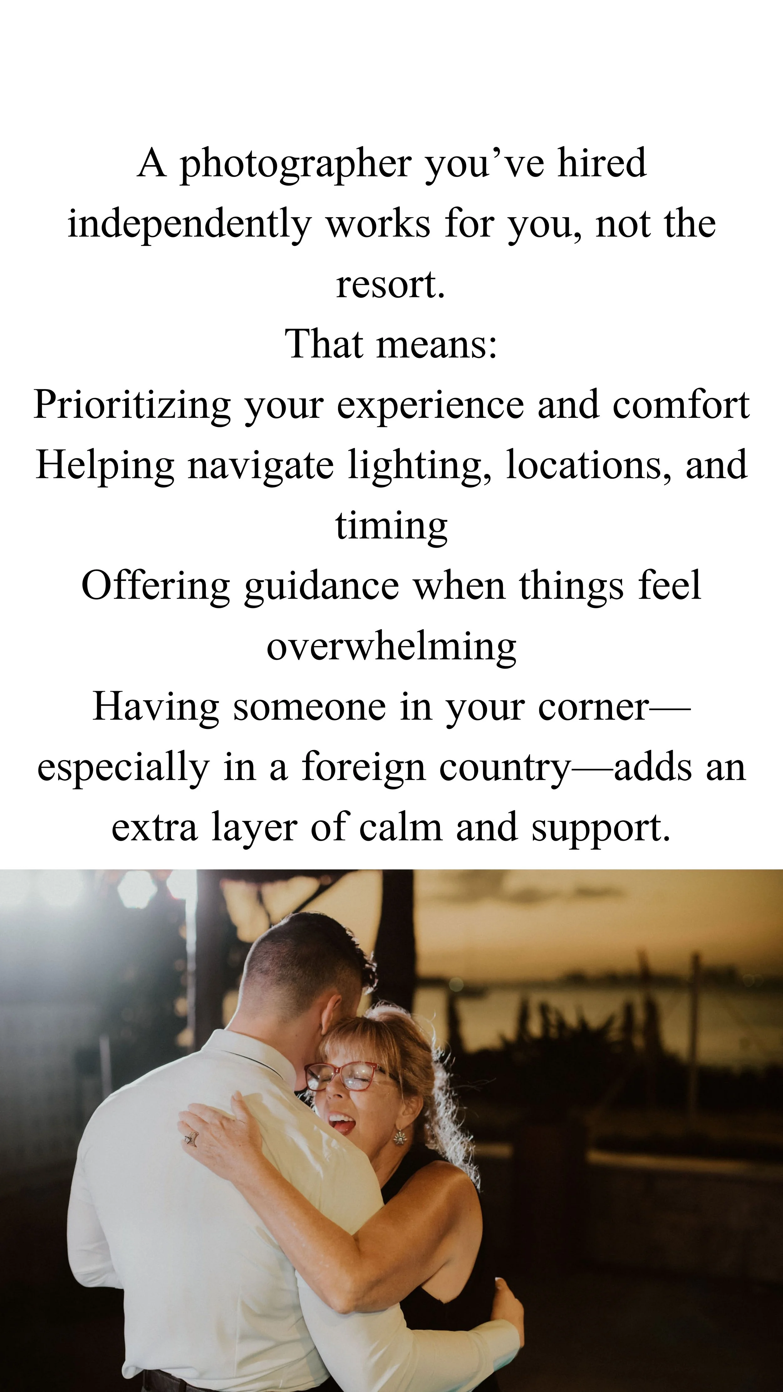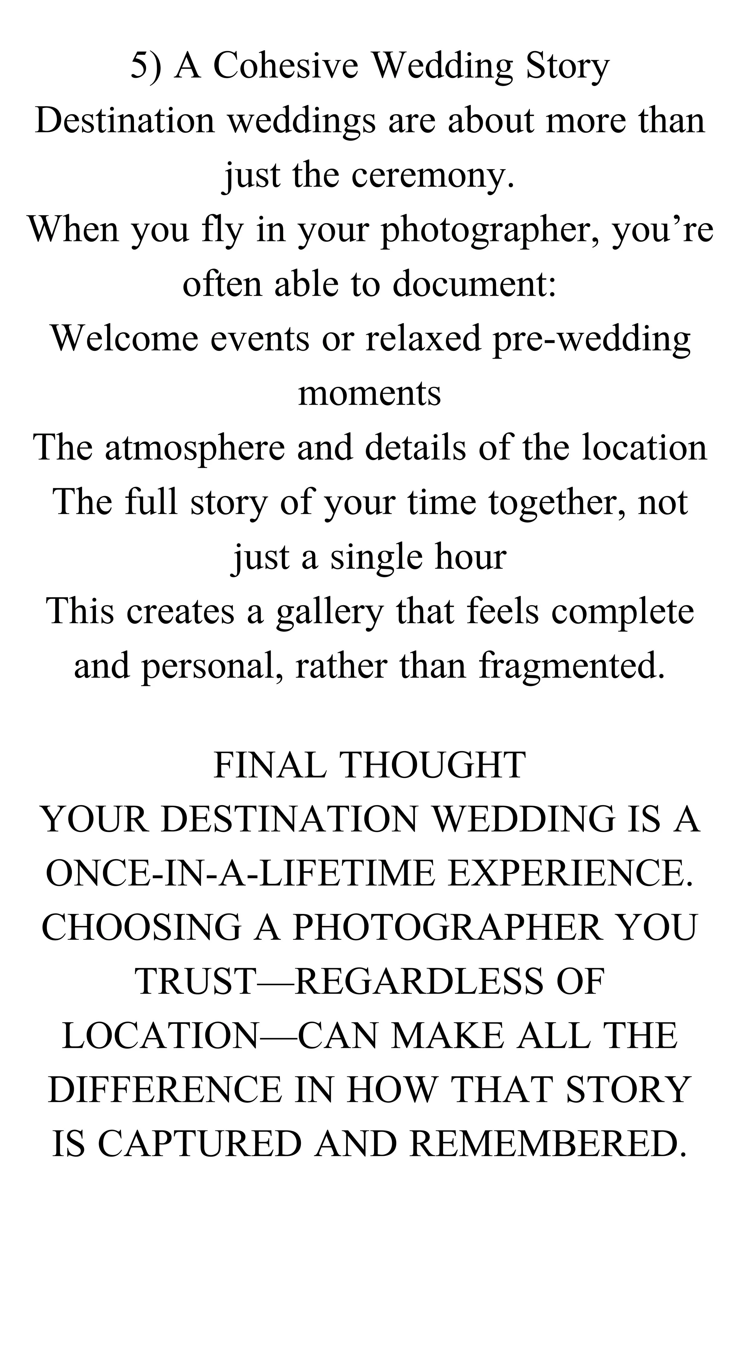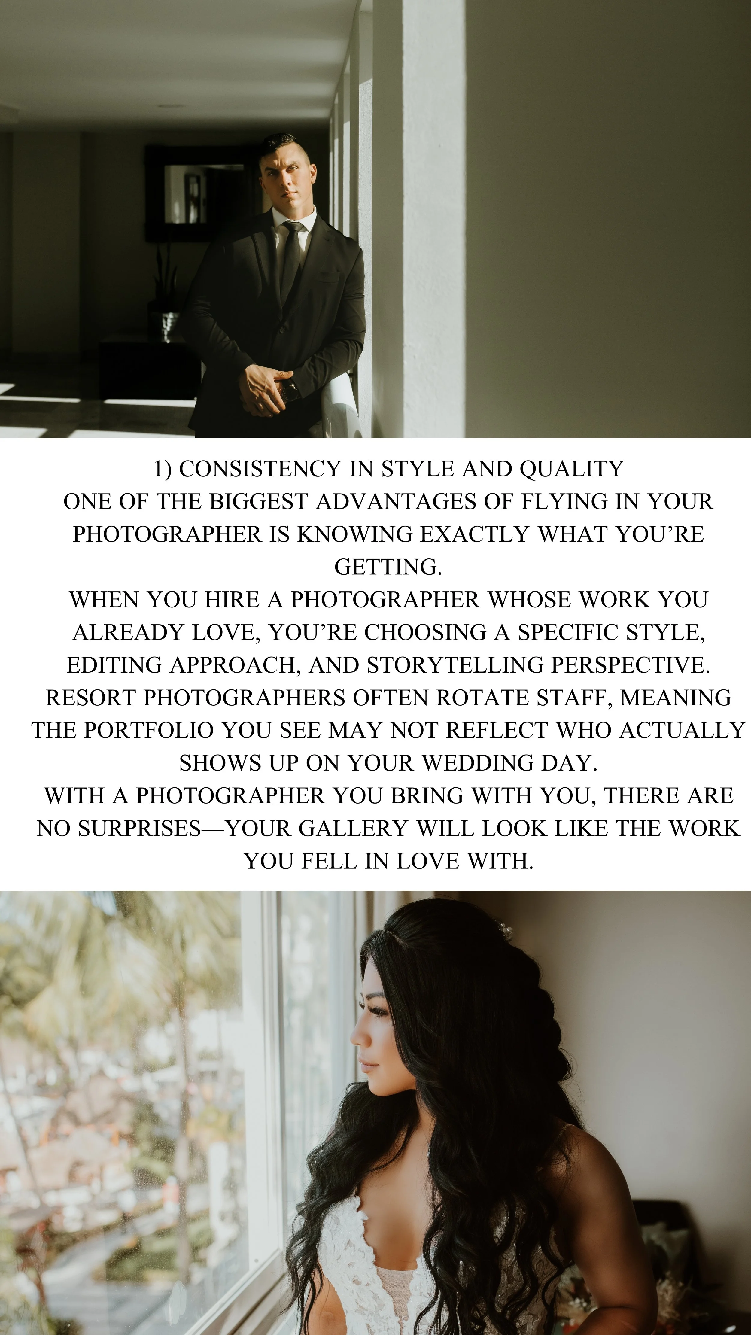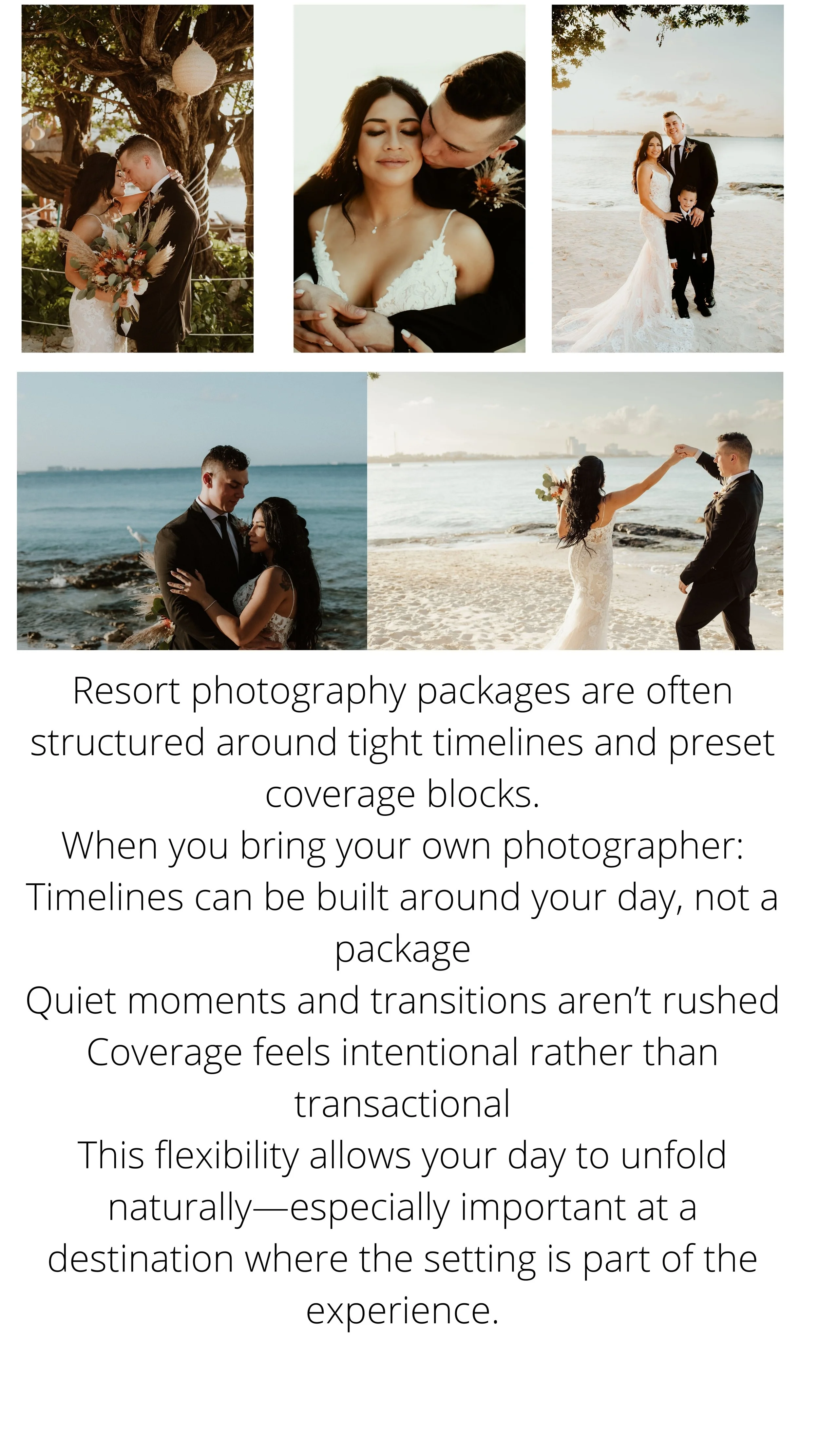 When planning a destination wedding, many couples are presented with a convenient option: using the resort’s in-house photographer. While this can seem like the easiest choice, many couples later realize that flying in their own photographer offers a far more personal and consistent experience.